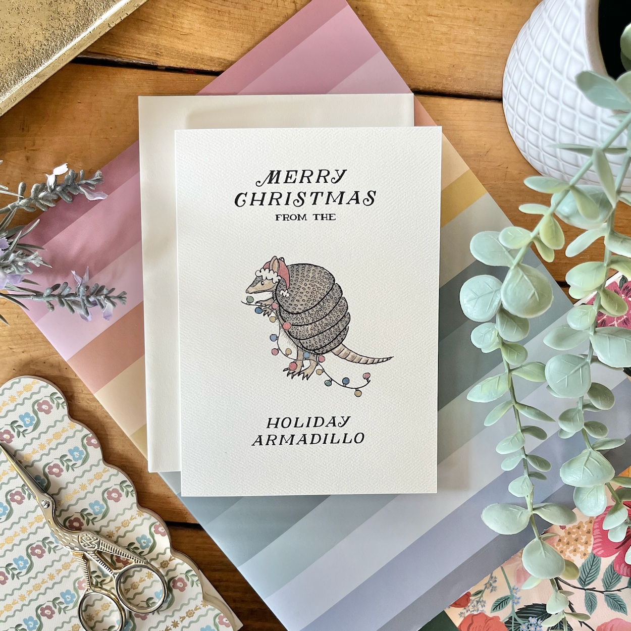A festive and whimsical holiday card featuring a hand-painted watercolour armadillo in our signature playful style. With the cheerful message “Merry Christmas from the Holiday Armadillo,” this card brings humour and charm to your holiday greetings.