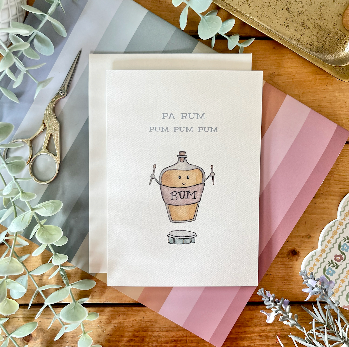 A festive and witty holiday card featuring a hand-painted watercolour illustration of a bottle of rum and a drum in our signature whimsical style. With the clever message “Pa Rum Rum Rum Pum,” this card adds a playful twist to classic Christmas cheer.